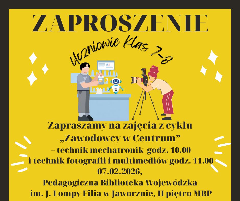 W dniu 7 lutego o godzinie 10.00 w Pedagogicznej Bibliotece Wojewódzkiej im. J. Lompy filia w Jaworznie (II piętro Miejskiej Biblioteki w rynku) czekamy na Ciebie. Poznasz sekrety tych dwóch zawodów. Technik mechatronik to osoba, która łączy wiedzę z mechaniki, elektroniki i informatyki, aby tworzyć i naprawiać nowoczesne urządzenia i roboty. W praktyce oznacza to, że potrafi obsługiwać i programować maszyny, które pomagają ludziom w pracy lub ułatwiają codzienne życie. Natomiast technik fotografii i multimediów to osoba, która potrafi robić profesjonalne zdjęcia, nagrywać filmy oraz tworzyć grafiki i animacje na potrzeby internetu i mediów. W swojej pracy używa aparatów, komputerów i specjalnych programów, aby przygotować ciekawe materiały, które można wykorzystać np. w reklamach, filmach czy mediach społecznościowych. Ale to nie wszystko! Więcej dowiesz się, kiedy przyjdziesz na zajęcia. Warto lepiej poznać te zawody.